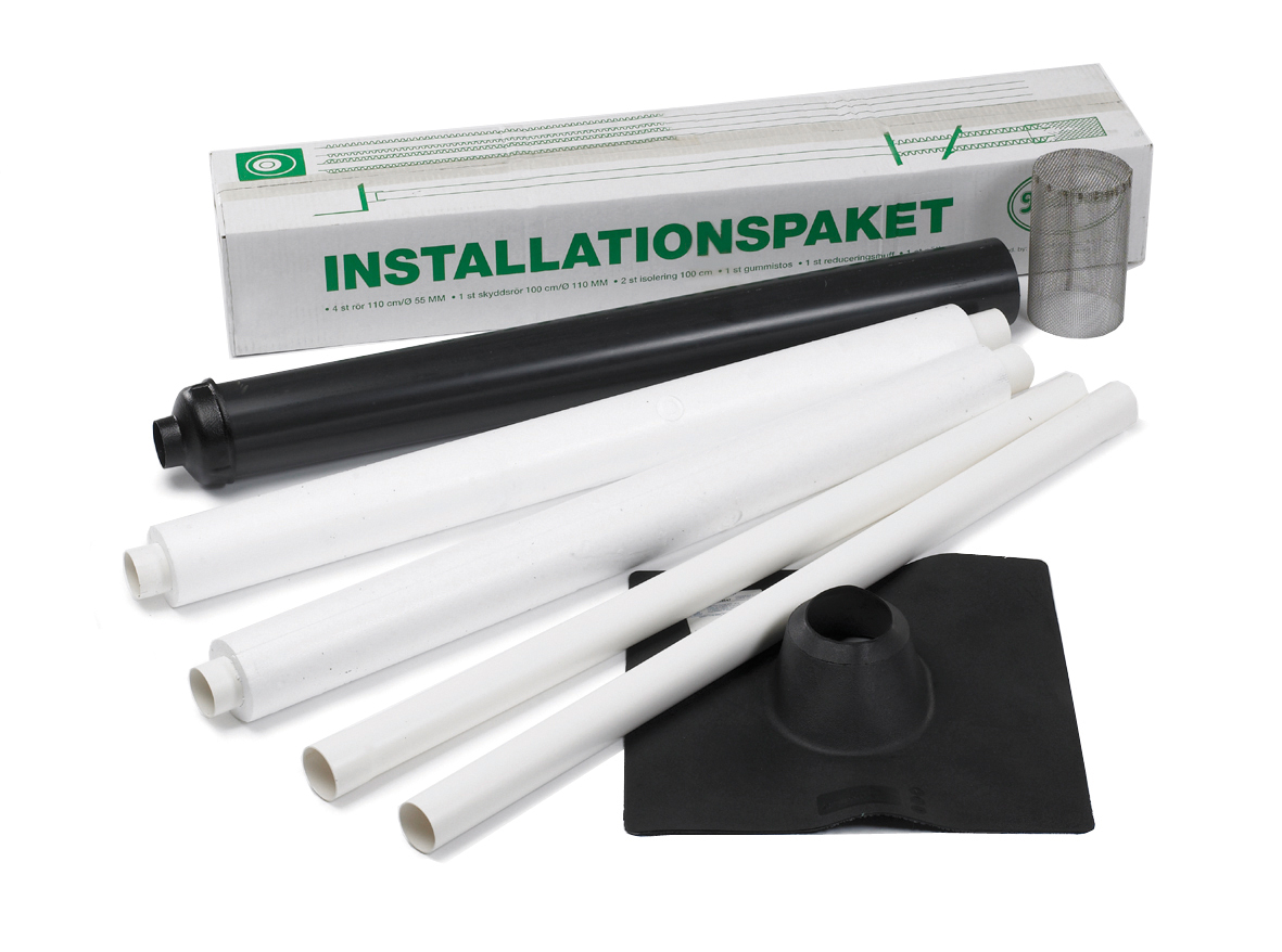 Extra tillbehör: 30 och 45 graders rörböjar, isolering, raka rör och startmull.